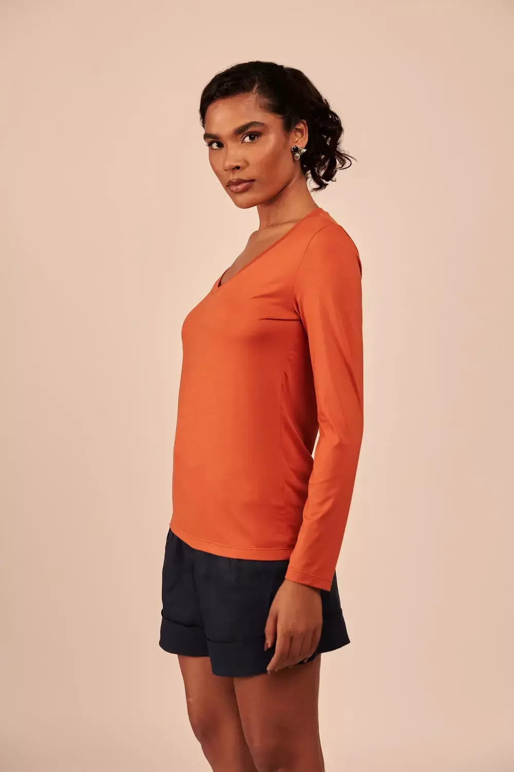 BLUSA MANGA LONGA GOLA V MODAL TERRACOTA