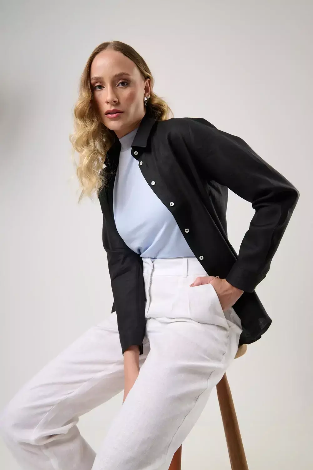 A Camisa de linho possui composição 100% Linho, um artigo extremamente sofisticado. Camisa lisa com abotoamento clássico frontal e abertura lateral, possibilitando o uso em ocasiões formais e também descontraídas. É um item essencial para um guarda-roupa Easy & Chic , em qualquer estação. COMPOSIÇÃO: 100% Linho **NOVO TECIDO** Possui uma gramatura mais leve.