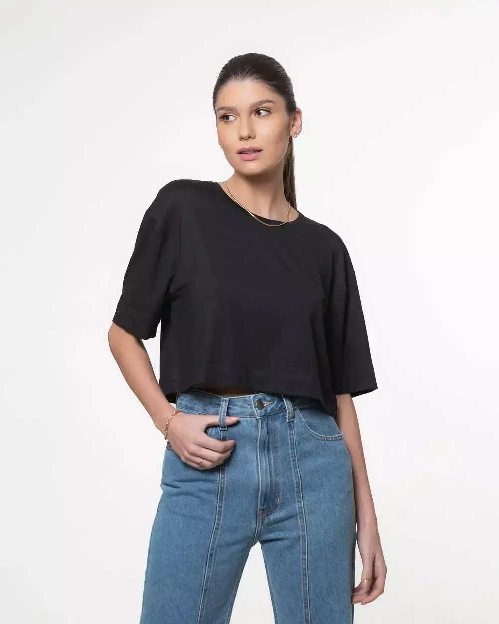T-SHIRT GOLA CARECA CROPPED MODAL PRETO
