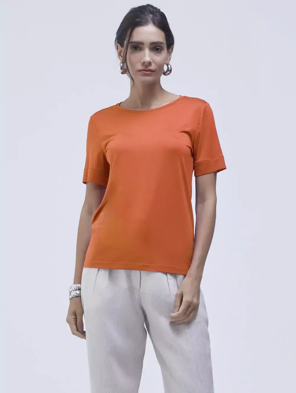 Nossa T-Shirt Gola Careca Modal, possui manga mais alongada com uma barra mais larga, isso para ter um caimento perfeito. Perfeita para usar em ambientes de trabalho e para ousar com sobreposições de vestidos e regatas. T-shirt Gola Careca Modal. Composição: 92% modal e 8% elastano O nosso Modal Premium é composto por fibras naturais feitas da celulose extraída da árvore Faia, localizada na Áustria. Todo o seu processo de extração e fabricação é cuidadosamente realizado para minimizar os danos ao meio ambiente, por isso é considerado um processo sustentável. Este tecido destaca-se por seu toque macio, leve, confortável e de alta durabilidade. O modal possui uma impressionante resistência ao encolhimento e ao peeling (as famosas bolinhas), além de ser um tecido que absorve bastante água, característica que ajuda na transpiração do corpo e faz com que a peça seja respirável. É um tecido projetado para não desbotar e possui um brilho sutil. Ele produz peças tão gostosas que você não vai querer tirar.